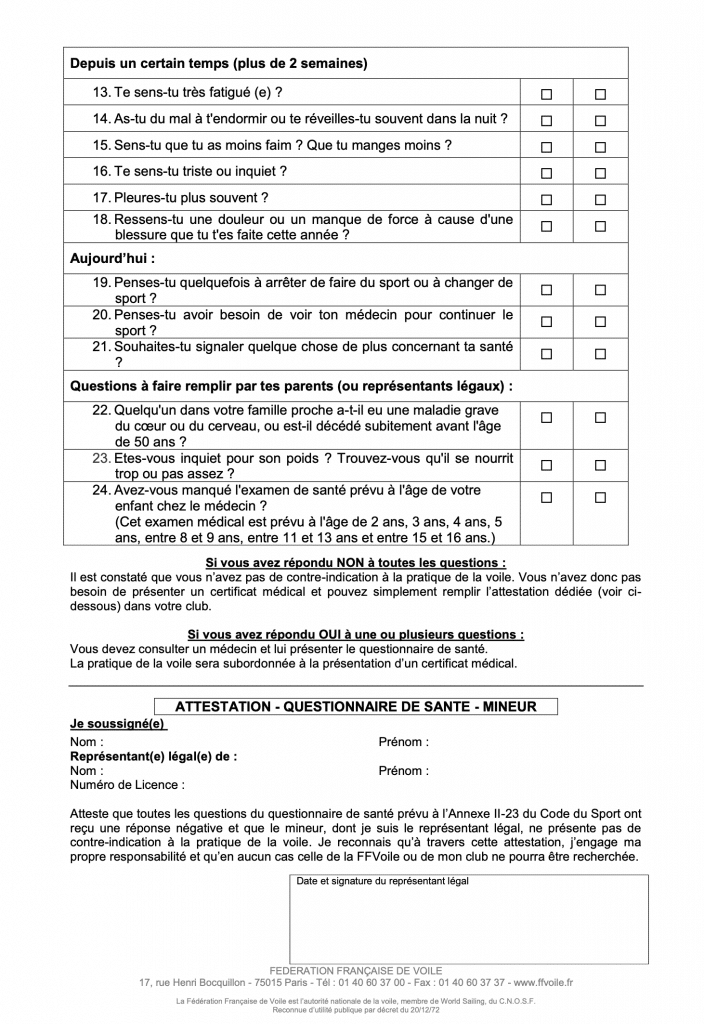 Voici le formulaire questionnaire de santé pour mineur 2026 obligatoire à remplir et amener le 1er jour de cours.