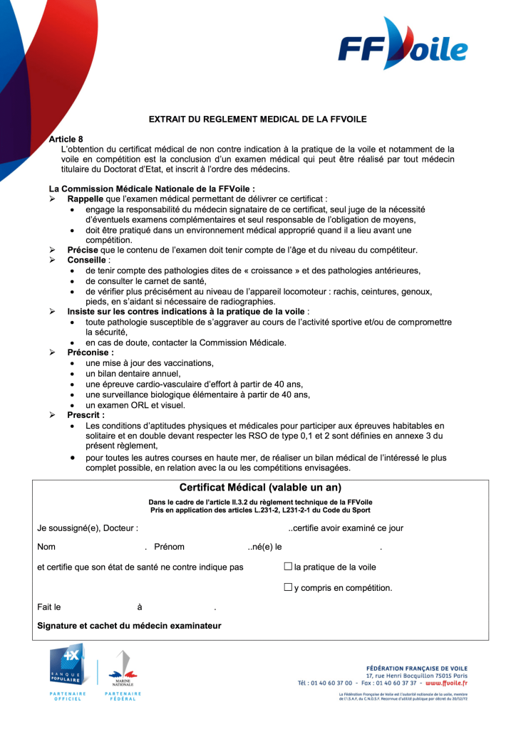 Si vous choisissez la licence FFVoile, le certificat médical est obligatoire uniquement pour la licence annuelle adulte; Pensez à le faire complété par votre médecin avant votre venue !
